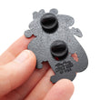 back of pin, showing backstamp of Little Shop of Pins and two posts with rubber clutches.