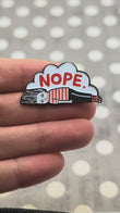 NOPE Enamel Pin by Gemma Correll and Badge Bomb. Embrace the power of "Nope" with our lapel pin - a quirky nod to introverts and those who appreciate the art of saying no to life's hustle and bustle. Place on your jacket, bag, or hat and let this pin speak for you when all other words fail. Hand-illustrated enamel pin. Packaged on backer card in a hang bag. Soft enamel with black metal finish. Two back posts with butterfly clasps. Measures approximately 36mm x 19mm. All purchases support 1% For The Planet!