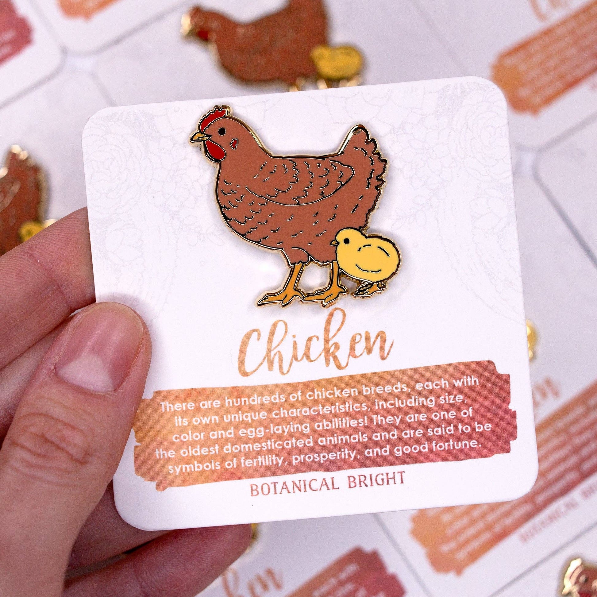 There are hundreds of chicken breeds, each with its own unique characteristics, including size, color and egg-laying abilities! They are one of the oldest domesticated animals and are said to be symbols of fertility, prosperity, and good fortune Each Pin is about 1.5" tall with a Gold base and is double posted.