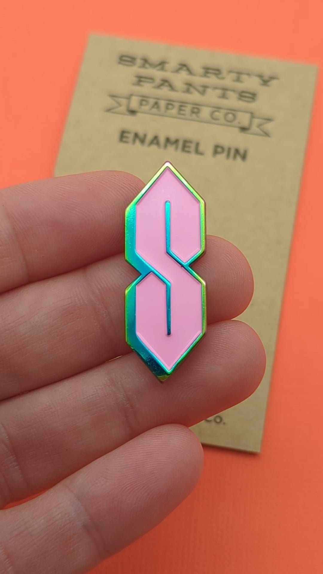 Cool S in pink enamel - Rainbow oil slick colored metal - 1.4" tall by .5" wide - Two pin posts with magenta rubber clutches - Soft enamel pin - 3.5" tall by 2" wide recycled kraft paper backing card - Designed in Knoxville, TN, produced in China